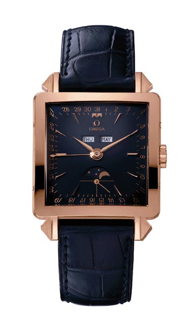 The Omega Museum Collection, “Cosmic”, Collector’s Series Number Two.Produced in the late 1990s. Fine, “carré galbé”, astronomic, 18K pink gold gentleman’s wristwatch with triple date calendar, moon phases and an 18K pink gold Omega buckle.