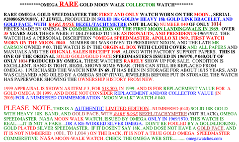 Omega Blogger’s fave ebay seller [sorry non-seller] is back hawking the “OMEGA RARE GOLD MOON WALK COLLECTOR WATCH” [moon walk, hahahaha].